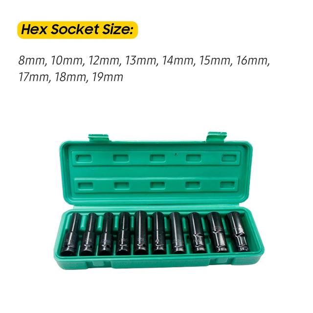 1/2 Deep Impact Wrench 8-24mm Socket Set Hexagon 78mm Length Mechanical Workshop Tool Hexs High Carbon Steel Electric Spanner – 10pcs 8-19mm B