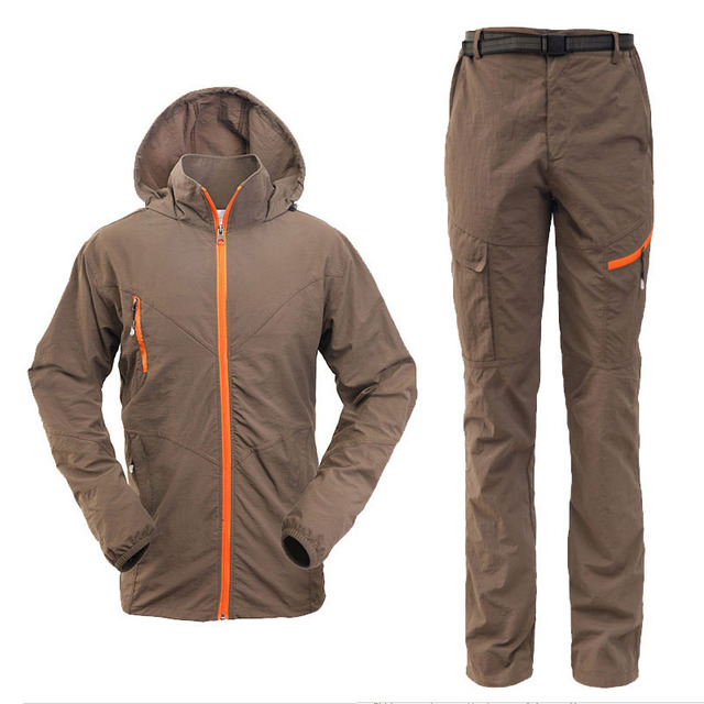 Camping Hiking Clothing Set Outdoor Sport Men Women Summer Sportswear Suit Hooded Jackets Pants Quick Dry Breathable Set ST01 – Men Brown, M